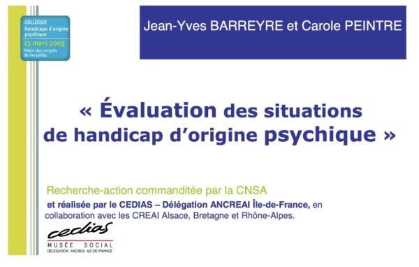 Le travail a porté sur l’élaboration et la validation d’un outil d’évaluation du handicap psychique (EHP) orienté de manière très pragmatique vers l’aide à la décision d’orientation et le choix des modalités d’étayage et de compensation. Face à la difficulté inhérente au manque de consistance interne du concept de handicap psychique, les chercheurs ont fait le choix d’organiser le champ d’observation (les difficultés dans les activités quotidiennes et la vie sociale) par les déterminants du handicap psychique. Ce parti pris visait également à résoudre le problème de l’environnement qui, selon sa nature et/ou sa qualité, contribue à la réduction ou à l’aggravation des conséquences des déficiences. Il s’est donc agi de passer du mode habituel de recueil des données prescrit par le regard social ou de sens commun à un niveau d’observation organisé par nos hypothèses sur les processus de production du handicap, en d’autres termes, de passer d’une clinique du handicap de sens commun à une clinique psychopathologique du handicap.